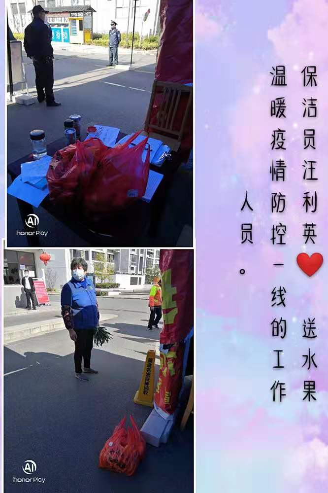 2020年2月9日,沙葛新村一位不愿透露姓名的業(yè)主給保安送去了一盒一次性手套,2020年2月11日,錦溪花園的保潔員汪利英給門衛(wèi)處送來(lái)了兩大袋沉甸甸的水果。作為奮斗在社區(qū)第一線的物業(yè)工作人員,在本該歡度新年的時(shí)刻里,他們投身社區(qū)防疫工作,用行動(dòng)為社區(qū)搭建起一層保護(hù)層,業(yè)主對(duì)他們的工作表示認(rèn)可,也希望他們?cè)诒M責(zé)工作的同時(shí)也多注意自我防護(hù),關(guān)注自身健康。